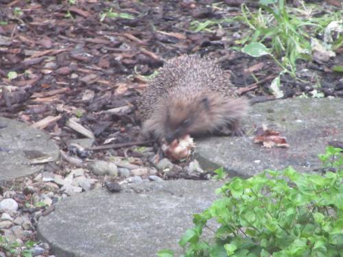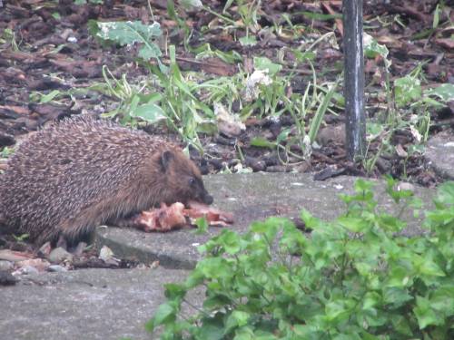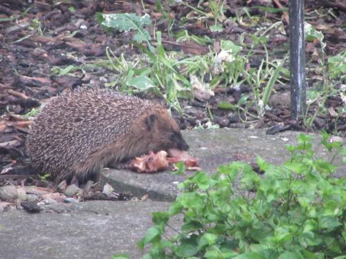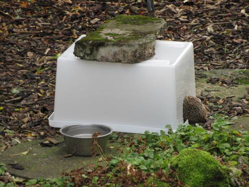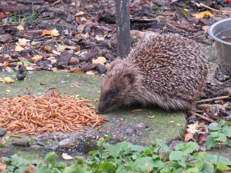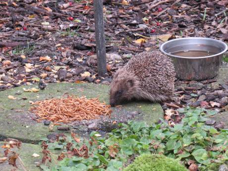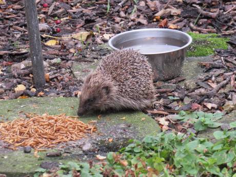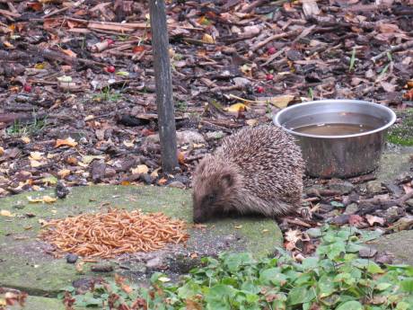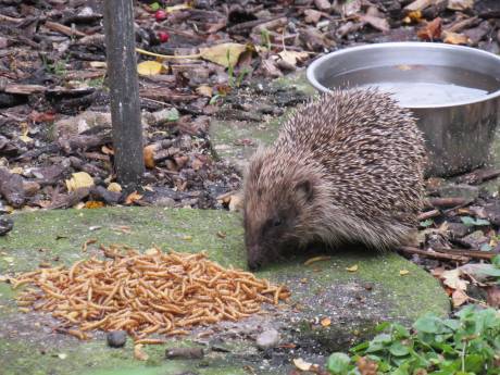 Thinking it may be searching for food I put out a pile of mealworms next to a water bowl already there. The hedgehog had a good feed and then went off into the ivy against the garage.