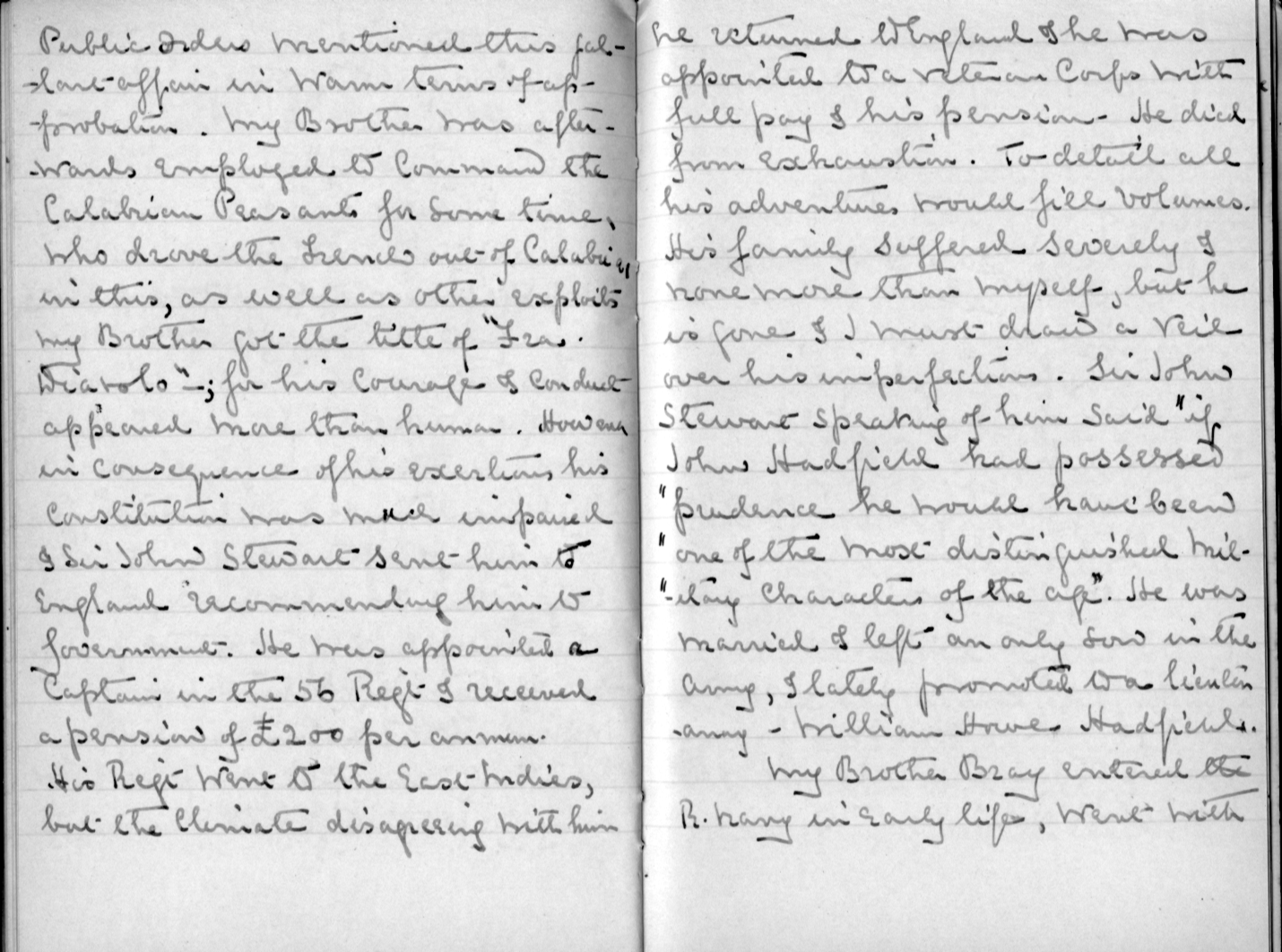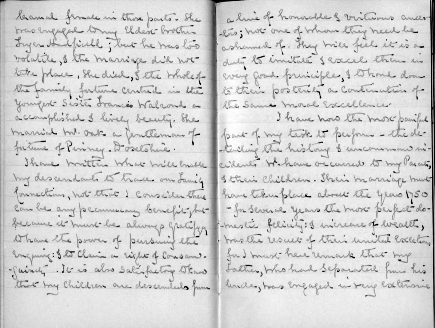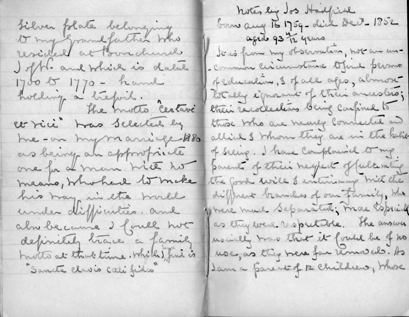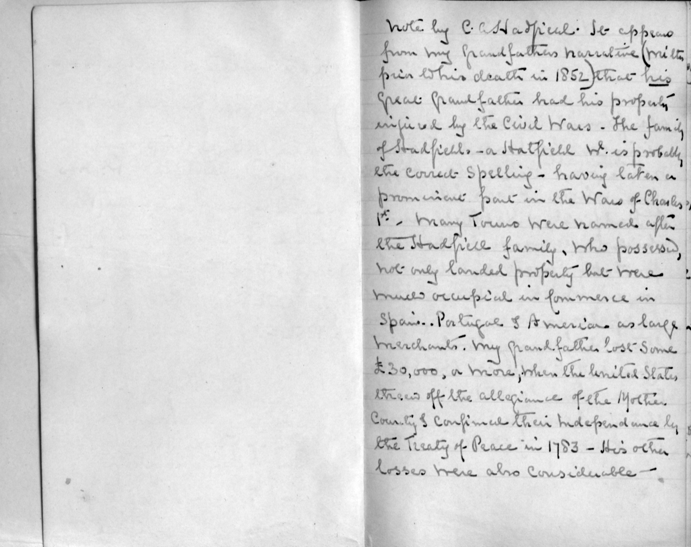 In April 2007 a member of the Rootschat forum came across a hand written book of Notes on family of Hadfields; Derbyshire & Yorkshire; EDALE & Holderness. I obtained the book from him, scanned it and sent the scans to David Hadfield in Australia who runs a free web site dedicated to publishing details of various Hadfield lines. David transcribed the book, keeping faith with the way it was originally written (i.e. as one would with a MI) and, at the time, was able to will supply a copy of the transcript to anyone who submitted a request to his e-mail address. As the years have passed, David is no longer able to do that so I have created this page to display the scans. In addition, the transcript can be downloaded in PDF form from Here.