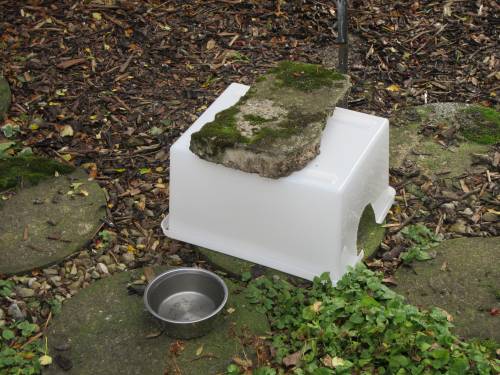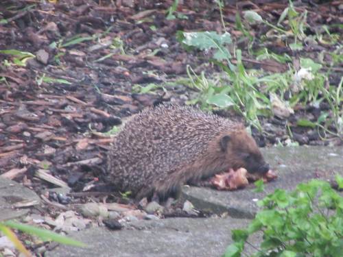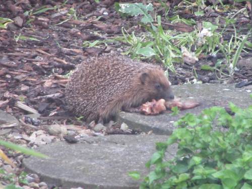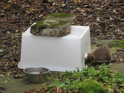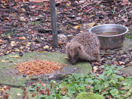 Thinking it may be searching for food I put out a pile of mealworms next to a water bowl already there. The hedgehog had a good feed and then went off into the ivy against the garage.